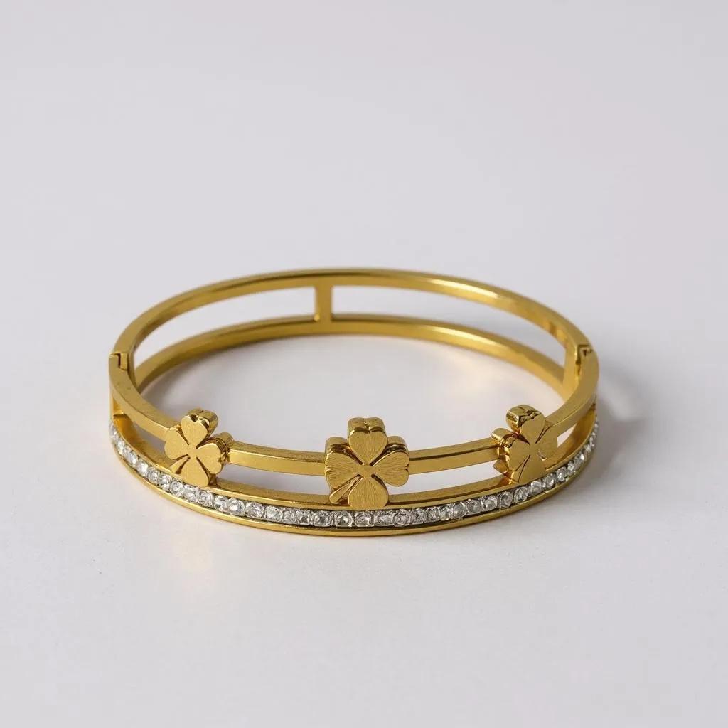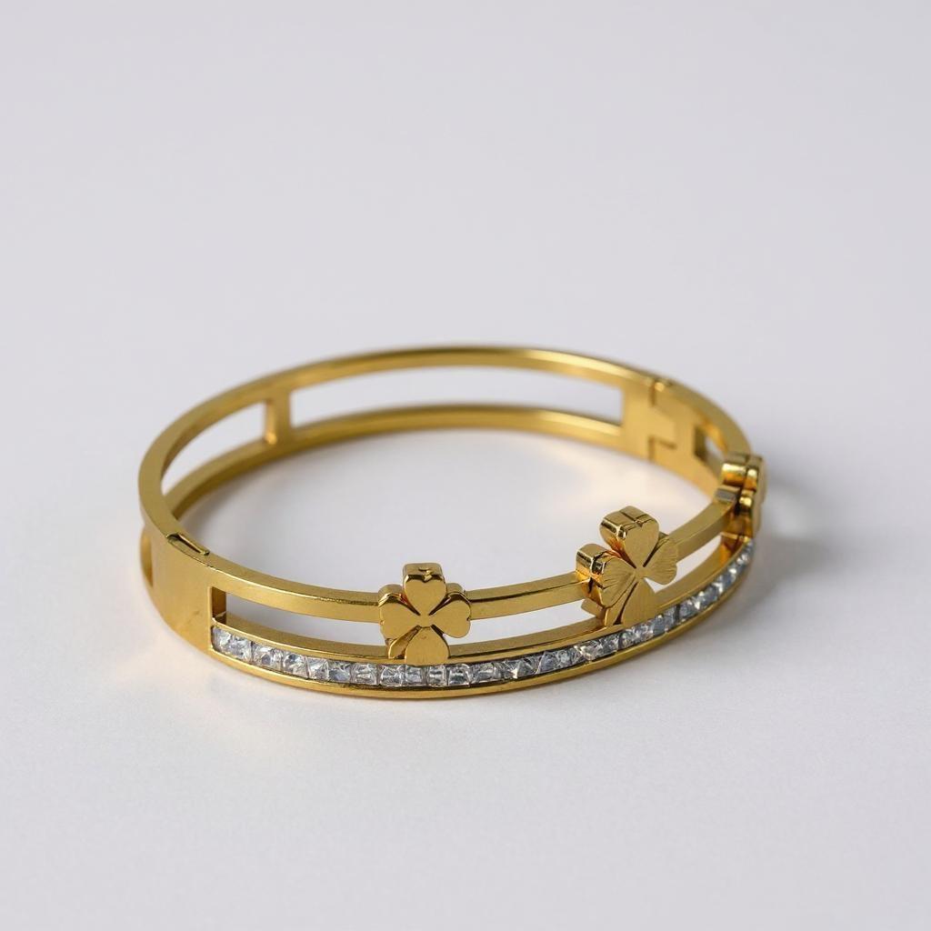 Add a touch of charm and sophistication to your style with the Golden Clover Elegance Bangle. Featuring delicate four-leaf clover motifs paired with a sparkling row of crystals, this bangle beautifully blends minimal elegance with a hint of glamour.