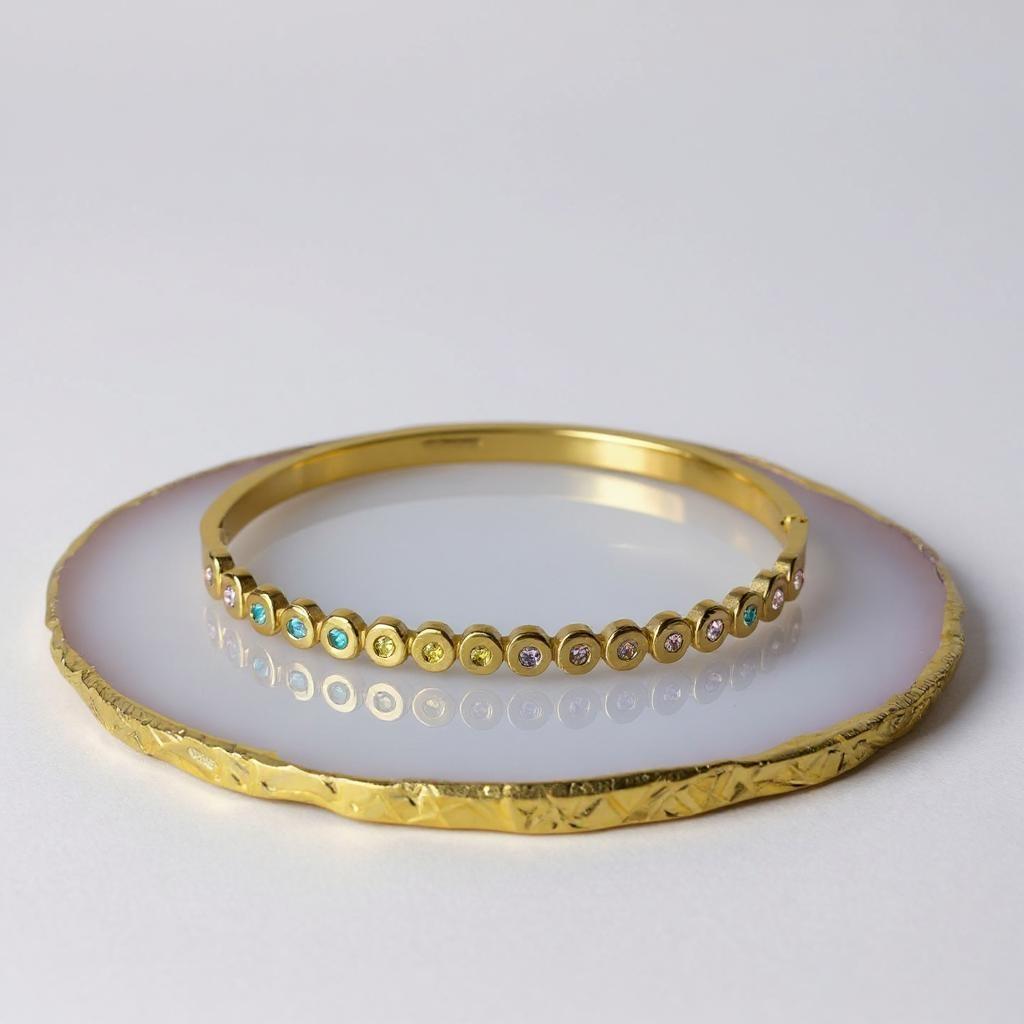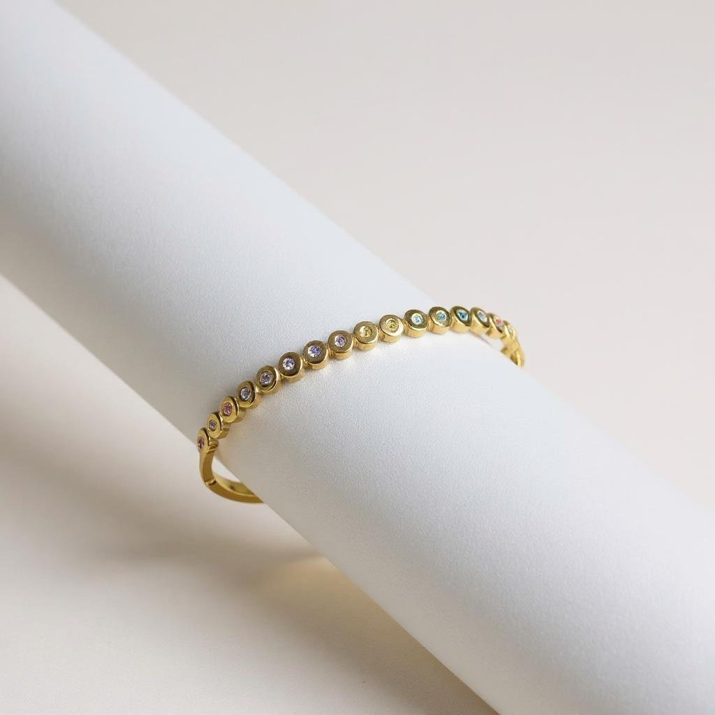 The circular crystal settings reflect light beautifully, adding a subtle sparkle to any outfit. Designed for comfort and durability, it’s an ideal accessory for daily wear or special occasions. Wear it solo for a pop of color or stack it with other bangles for a chic layered look.